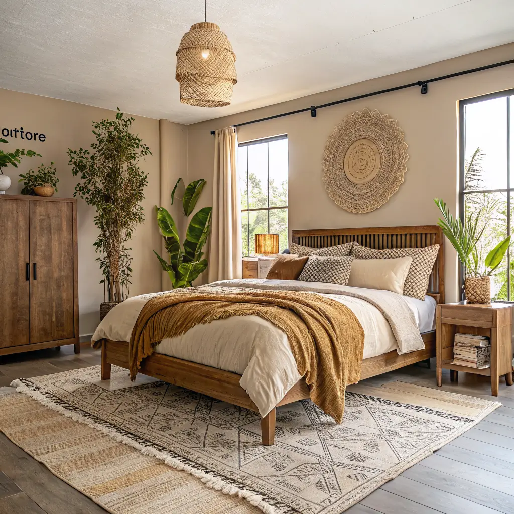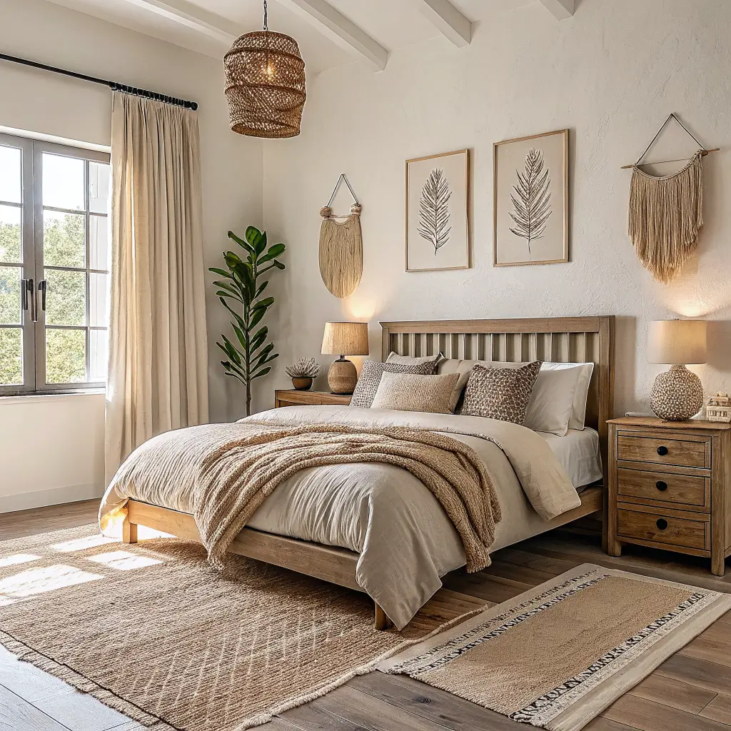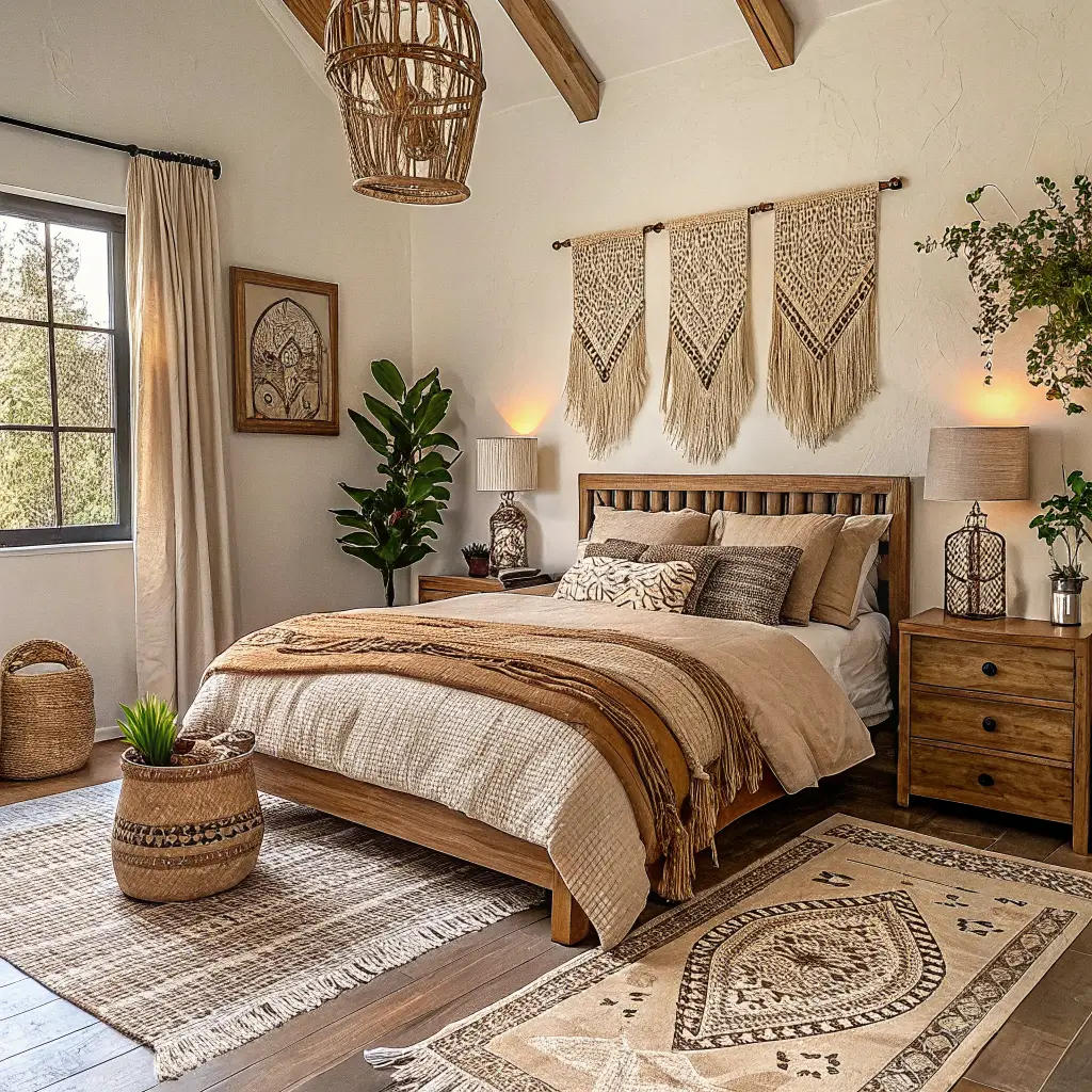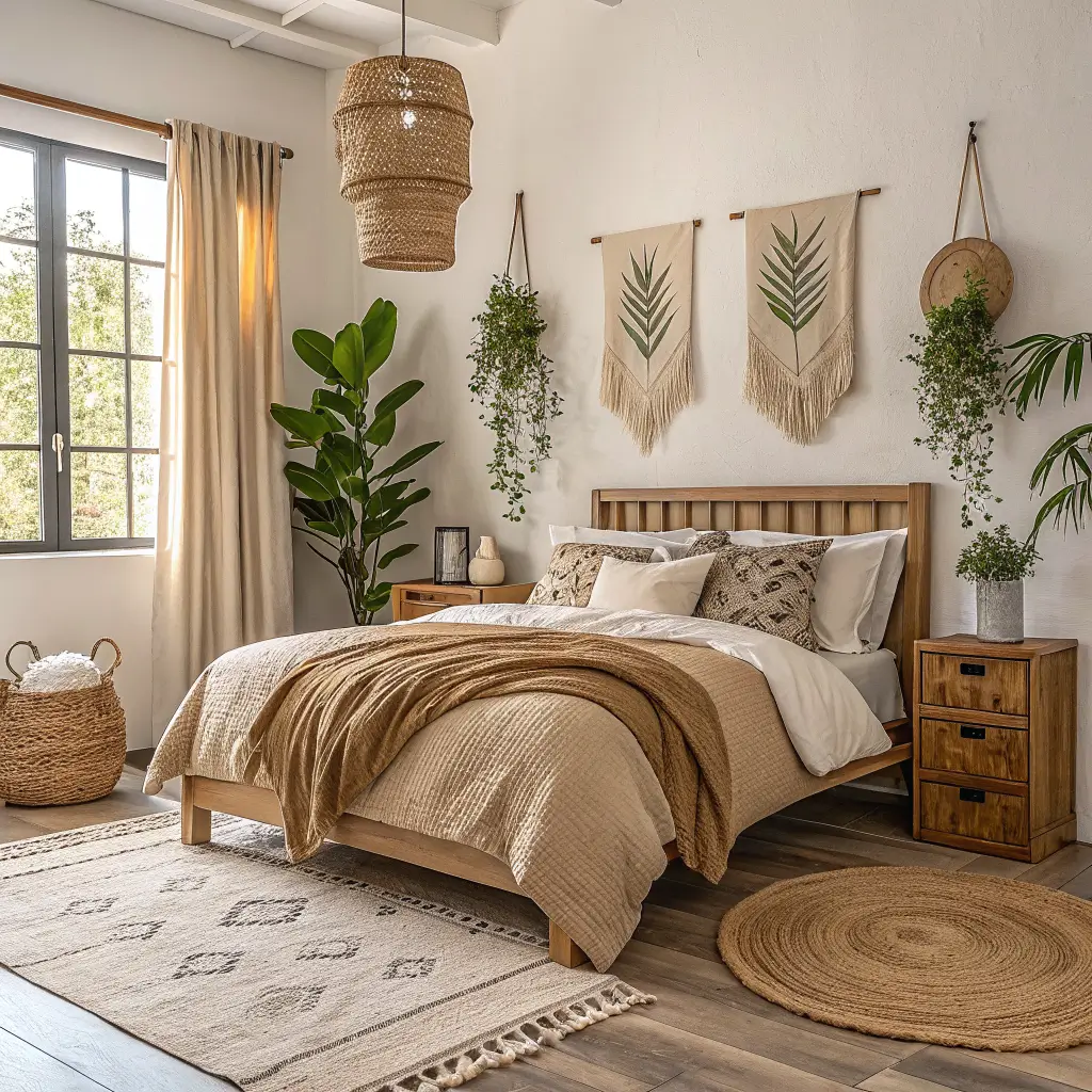 Don’t forget the plants. Bohemian spaces breathe with life, so add greenery everywhere. Hanging planters, windowsill herbs, or a statement fiddle leaf fig tree bring that organic element boho style needs.