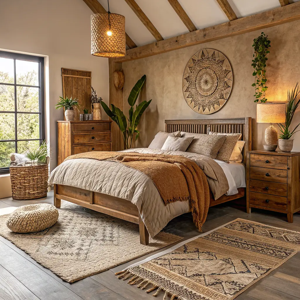 Your bed needs presence. A chunky wooden frame or an iron bed with rustic appeal works perfectly. Skip the matching bedroom set (boring!) and mix pieces like they’ve been collected over generations. That mismatched nightstand situation? Totally intentional, IMO.