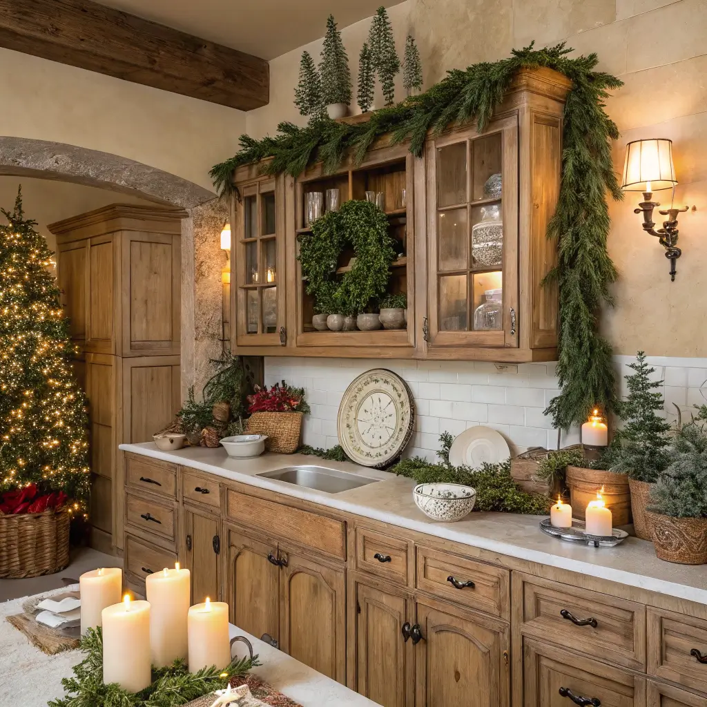 The kitchen needs love too, especially since that’s where everyone congregates anyway. French country kitchen Christmas decor keeps things functional yet festive.