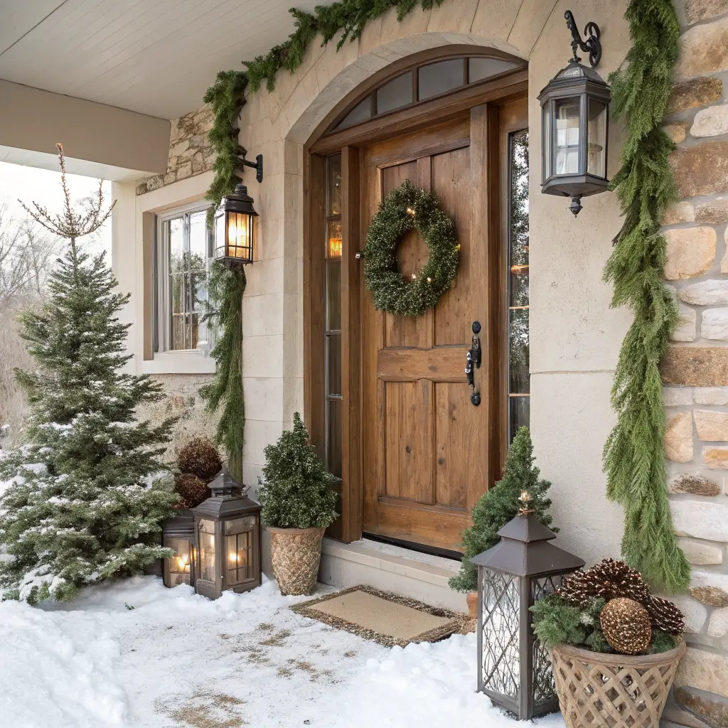 IMO, the best French country porches look naturally festive, not like a decoration explosion. Start with a gorgeous wreath (we covered that already), then add lanterns with battery candles, some greenery in galvanized buckets, and call it done.