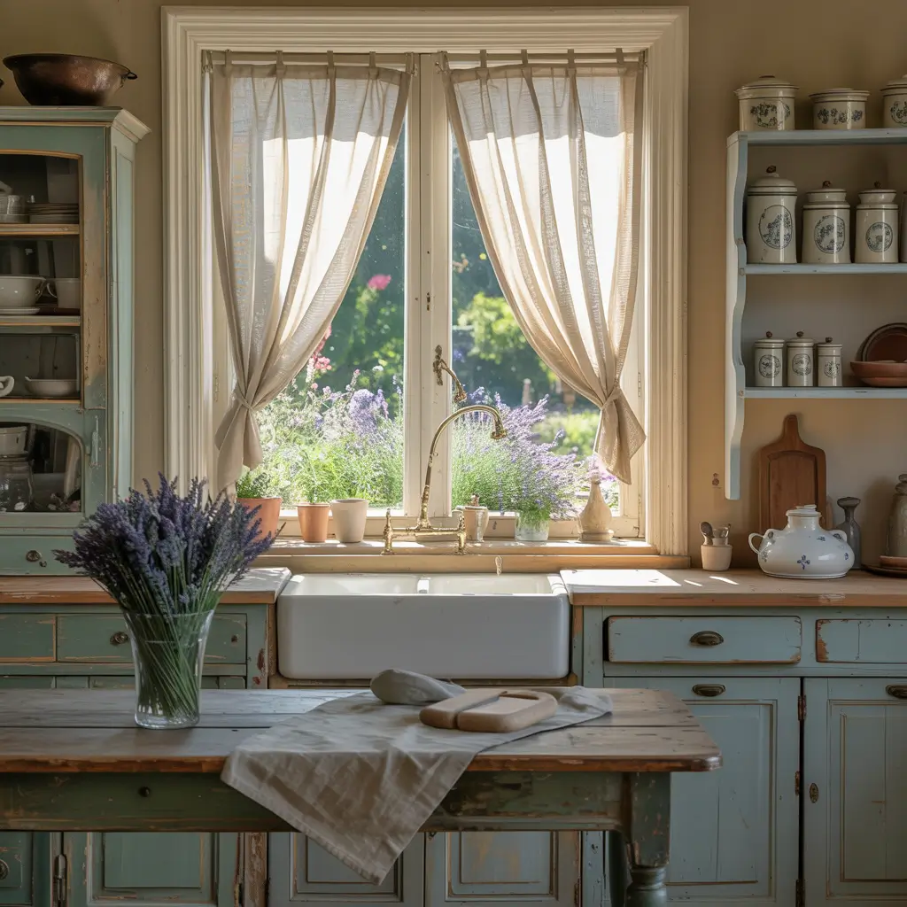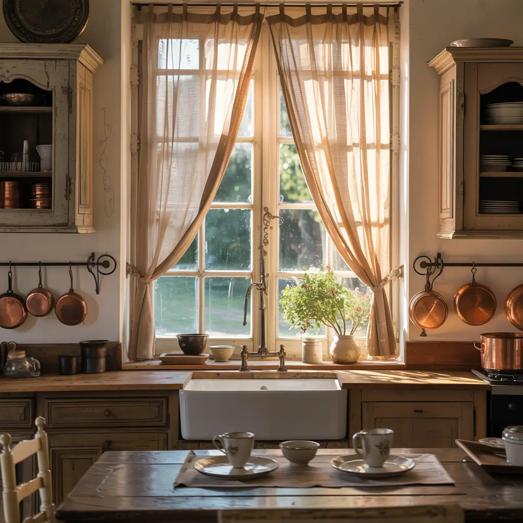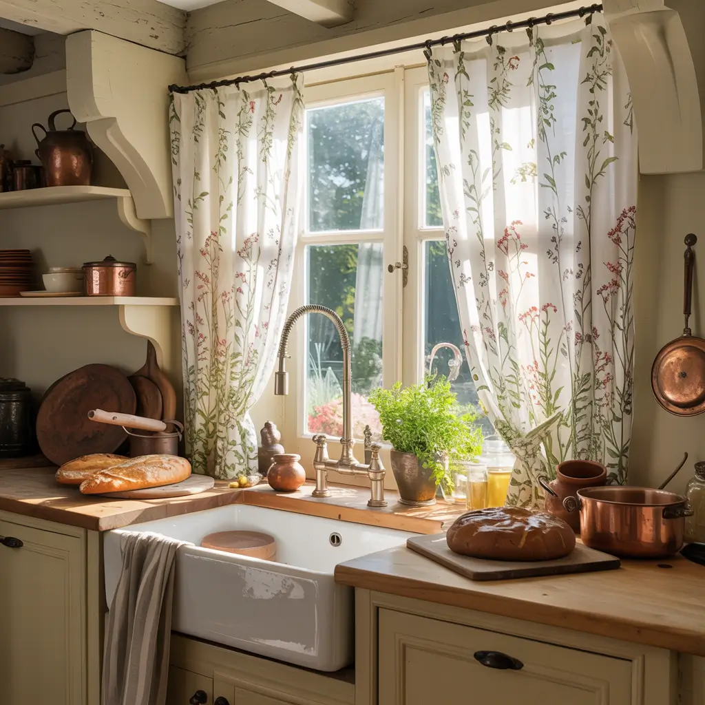 Sheer curtains in a French country kitchen? Absolutely! They create that dreamy, soft-focus effect that makes everything look better (kind of like an Instagram filter for your kitchen).