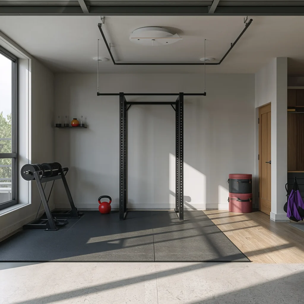 Position heavy equipment against walls. Keep the center open for functional movements, cardio, and stretching. Clear pathways between zones prevent accidents when you’re exhausted.