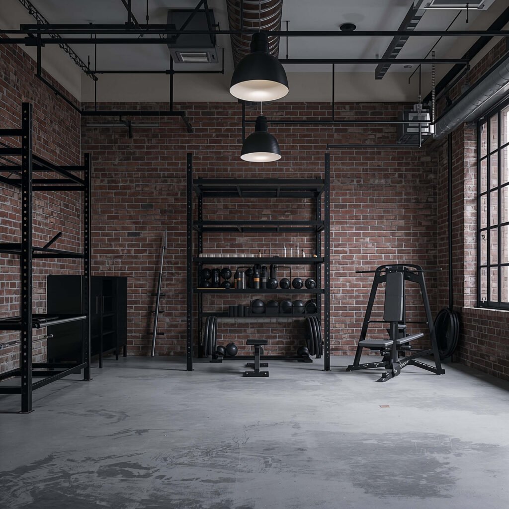 Exposed steel beams and pipes become design features instead of eyesores. Paint them matte black for that industrial edge. Mount your pull-up bar directly to ceiling beams – functional and aesthetic.