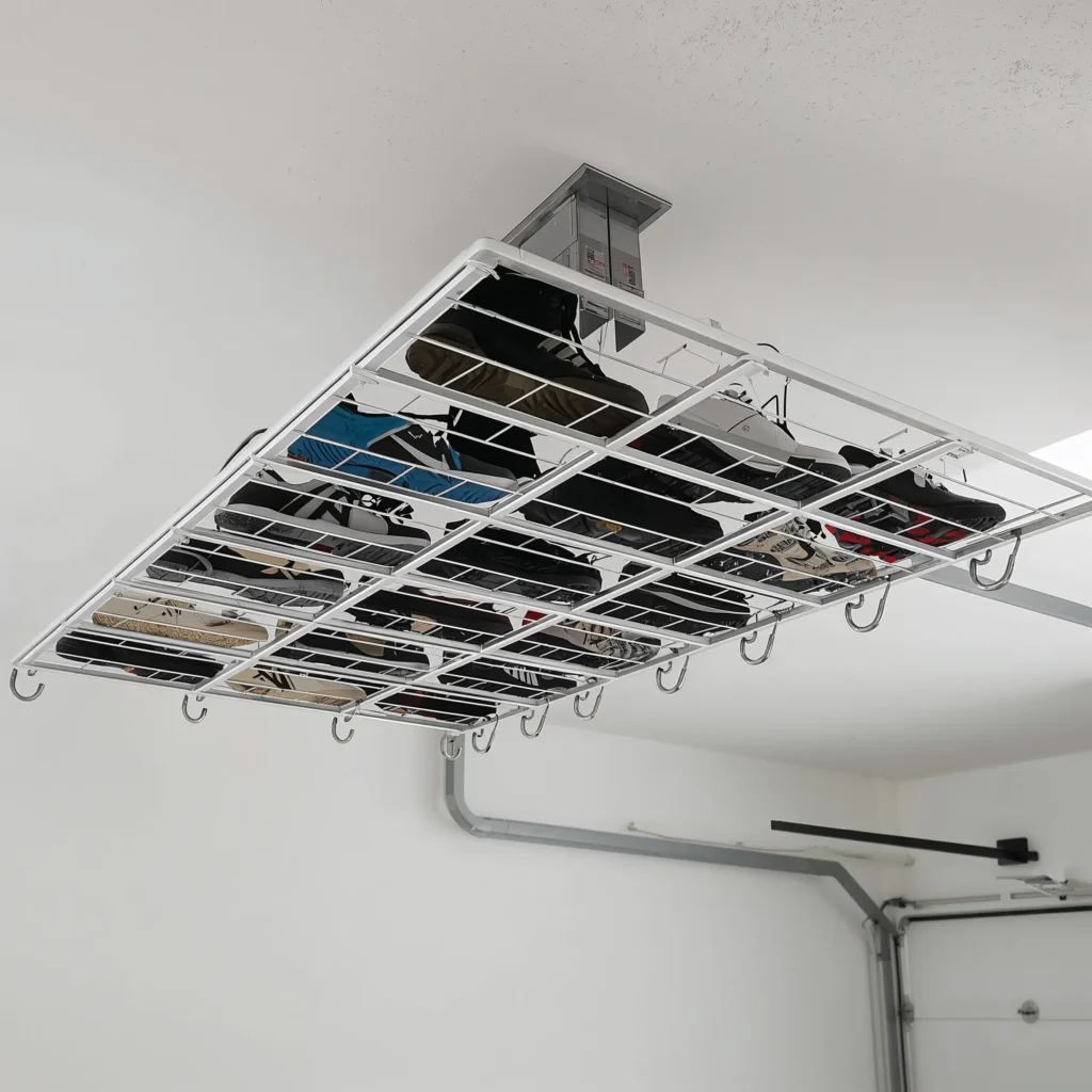 Let’s start with my personal favorite – the game-changer that freed up so much floor space I actually found my garage floor again. An overhead shoe rack with hooks takes advantage of that dead space above your head that you’re probably not using anyway.