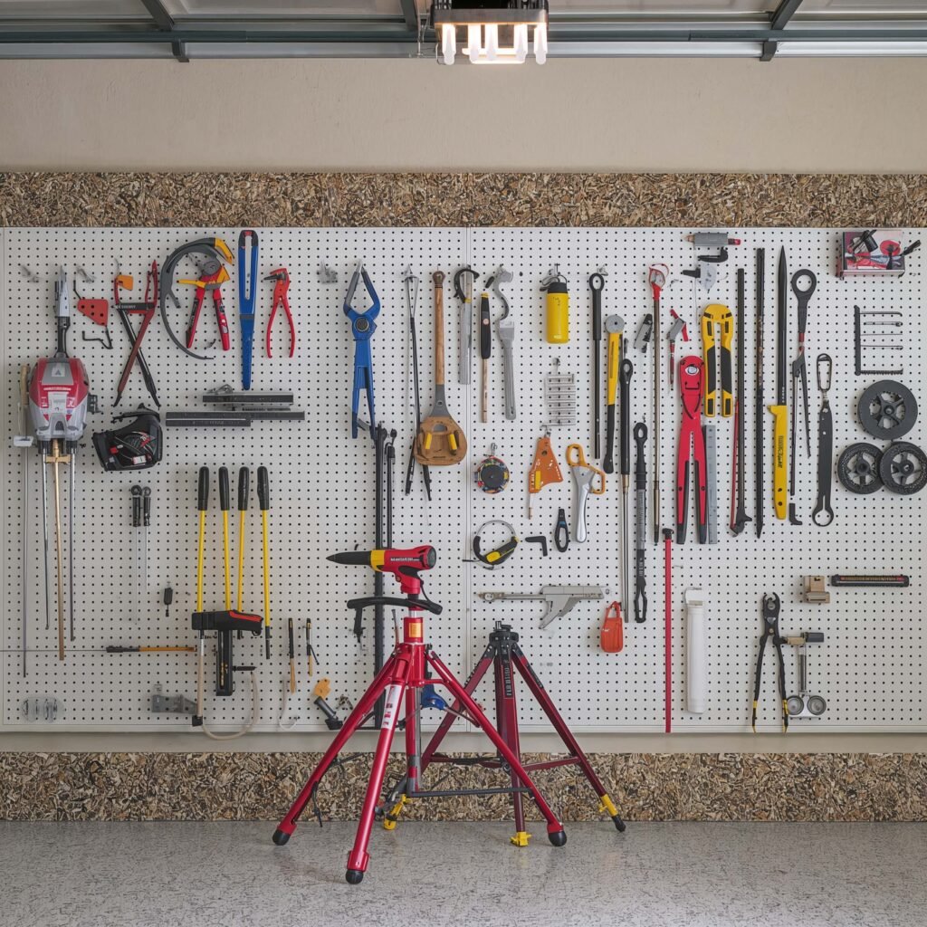 I turned an entire wall of my garage into a pegboard system. Shoes hang from heavy-duty hooks, while small shelves hold everything from shoe polish to spare laces. The kids’ sports shoes go on color-coded hooks (blue for soccer, red for baseball), which ended the morning scramble of “Where are my cleats?”
