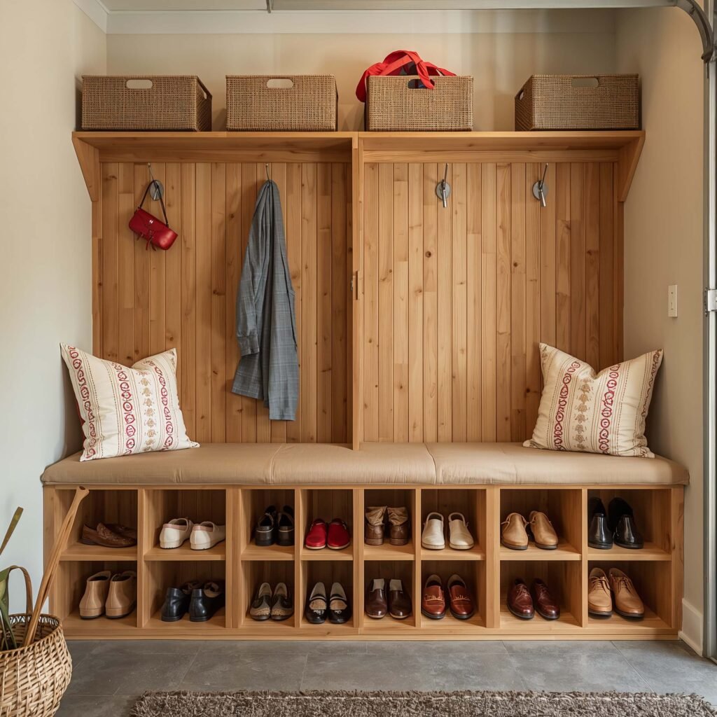 shoe storage bench pulls double duty, and honestly, it’s the MVP of garage organization. You get a place to sit while putting on shoes PLUS hidden storage underneath. Why didn’t someone think of this sooner?