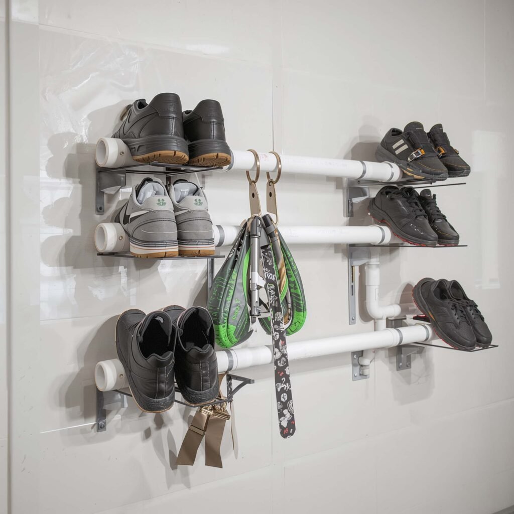 Last but definitely not least, let’s talk PVC pipe shoe holders â€“ the surprisingly stylish solution that started as a plumbing aisle accident. I discovered this idea when I spotted large-diameter PVC pipes and thought, “Hey, those look about shoe-sized.”