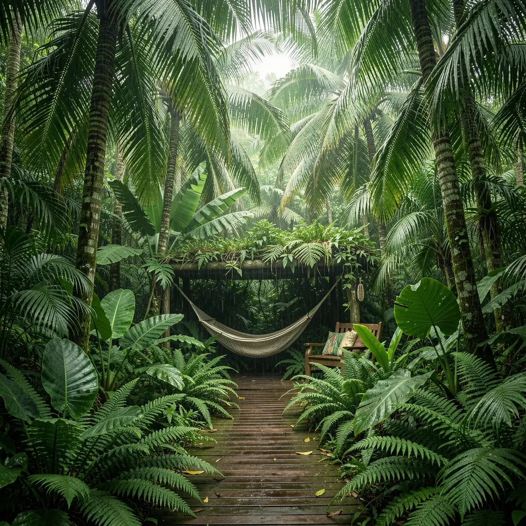 This layout is all about layering—canopy trees, understory plants, ground covers, and climbing vines all working together to create that dense, mysterious jungle feeling. The key is choosing plants with different leaf textures, sizes, and shapes to build visual complexity.