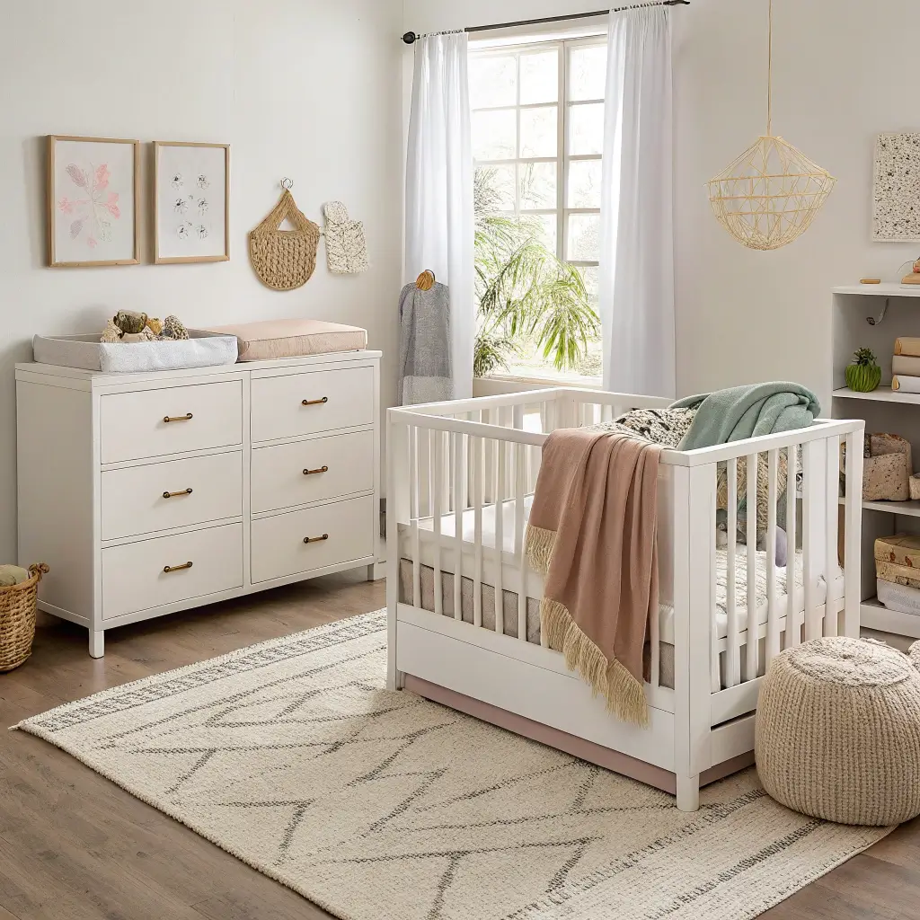 Start with a wooden crib – and I mean real wood, not that laminate stuff that chips when you look at it wrong. Add some woven baskets for storage because they’re practical AND they look amazing. Throw in a jute rug that’s soft enough for tummy time but durable enough to handle the inevitable spills.