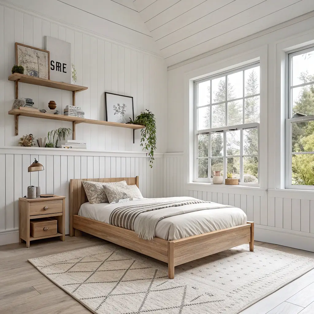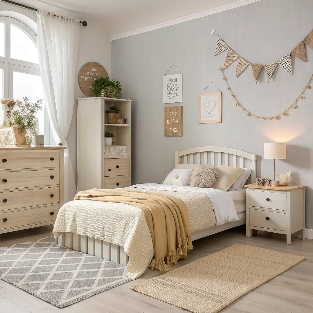 Start with white walls and light wood floors (or laminate that looks like wood – we’re being realistic here). Add pops of muted colors through textiles – dusty pink, sage green, or soft yellow work beautifully. The furniture should be simple but well-made, with clean lines and practical storage.