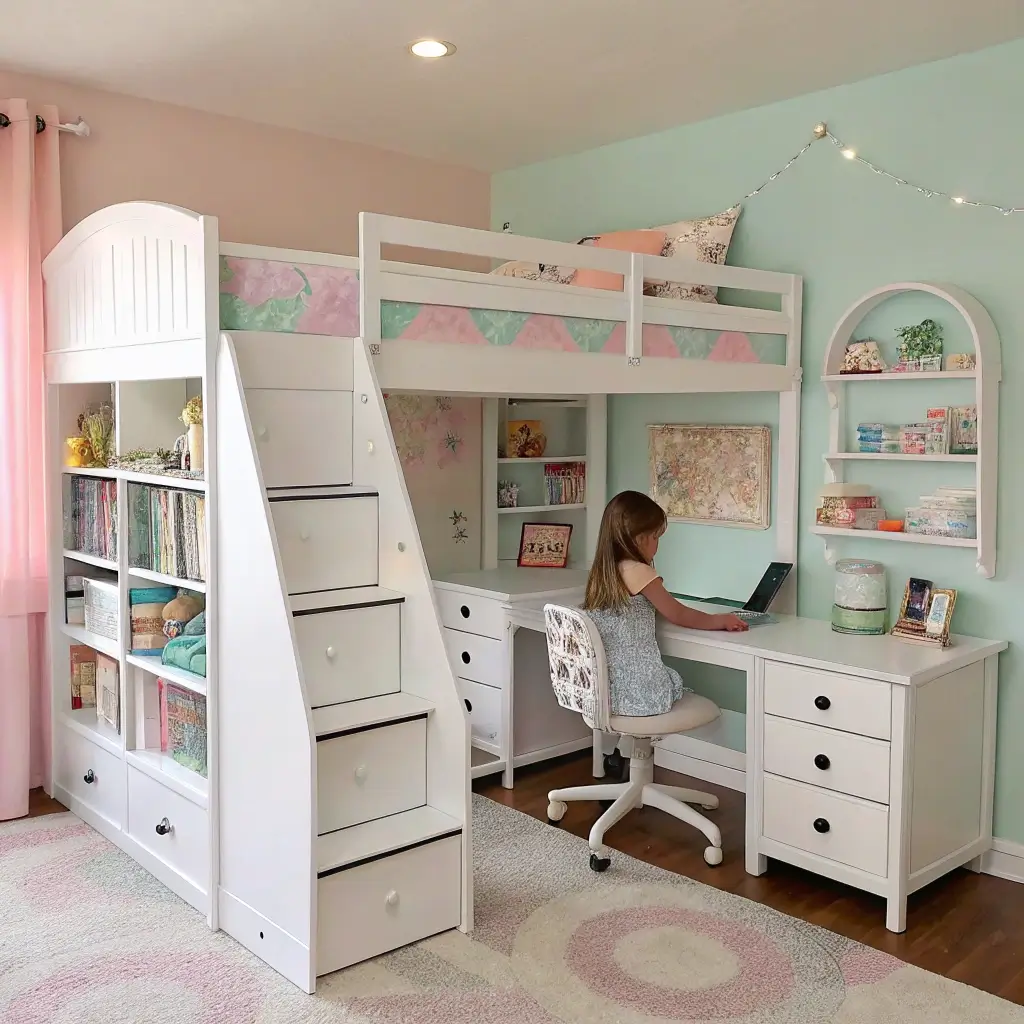Vertical space becomes your best friend here. Loft beds free up floor space for a desk or play area underneath. Wall-mounted everything – desks, shelves, even bedside tables – keeps the floor clear and the room feeling open. Built-in storage benches under windows? Pure genius for hiding toys and clothes while creating extra seating.