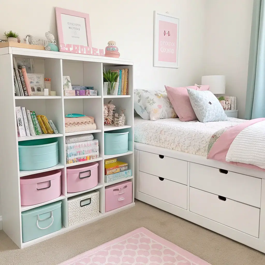 Under-bed storage boxes on wheels make cleanup a breeze. Pegboards painted in fun colors turn wall storage into art. Floating shelves at different heights create visual interest while displaying favorite items. And those cube organizers everyone has? Transform them with fabric bins in coordinating colors or patterns.