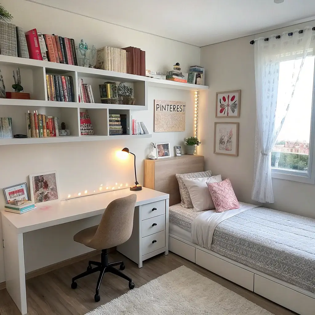 Position the desk near a window for natural light, but not directly in front of it (trust me, the distractions are real). Create zones – sleeping area, study area, and relaxation area – using furniture placement or area rugs. Good task lighting prevents eye strain during late-night study sessions.
