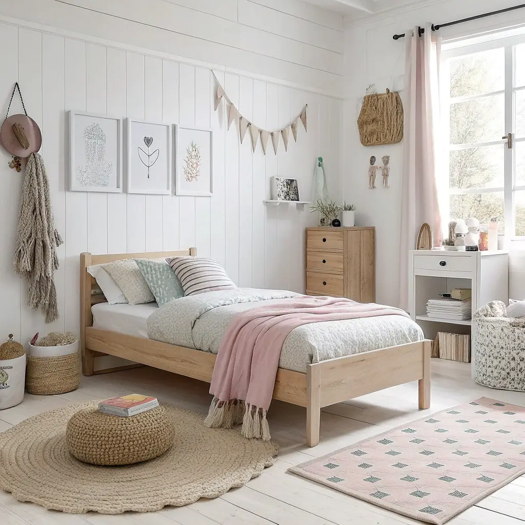 Scandinavian design brings simplicity, functionality, and coziness together in perfect harmony. This style works brilliantly for girls’ bedrooms because it grows with them – the clean foundation adapts to changing tastes without major renovations.