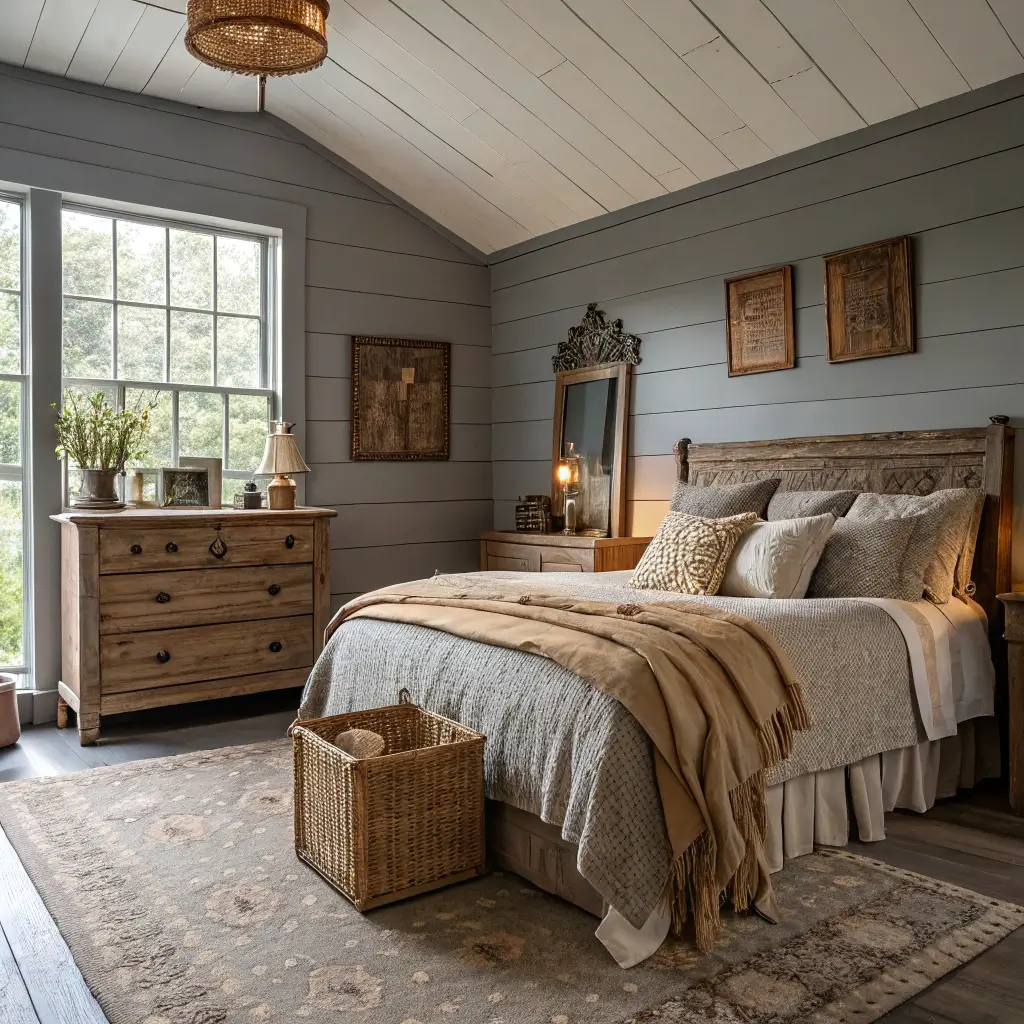 Start with weathered gray wood elements – maybe a reclaimed wood headboard or exposed ceiling beams if you’re lucky enough to have them. Then warm things up with beige linens and cozy throws. The beauty of this style is that it encourages mixing textures and patterns, so don’t be afraid to combine buffalo check with florals or stripes with solids.