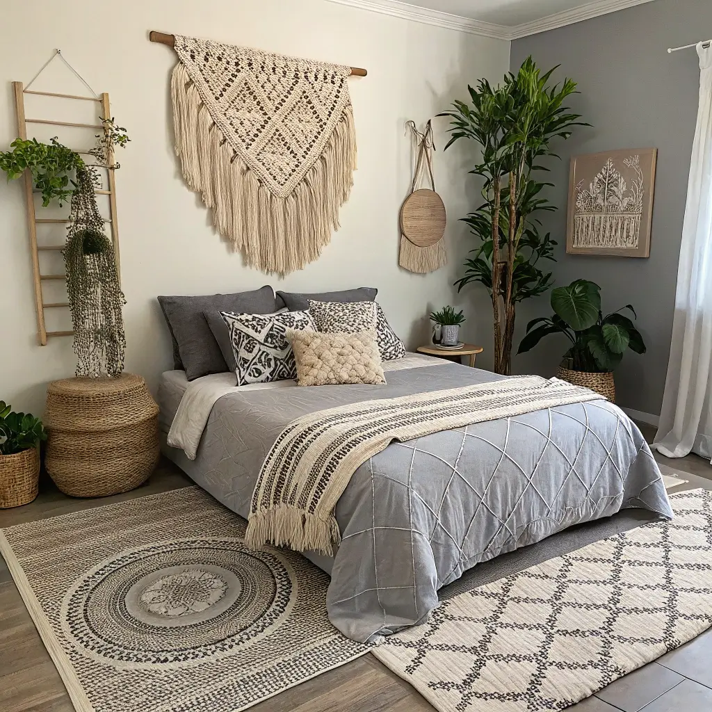 Start with a neutral base – beige walls and gray bedding work perfectly. Then layer in those boho elements through textures and patterns. Macrame wall hangings, woven baskets, pampas grass, and layered rugs all add that bohemian flair without introducing a million colors.