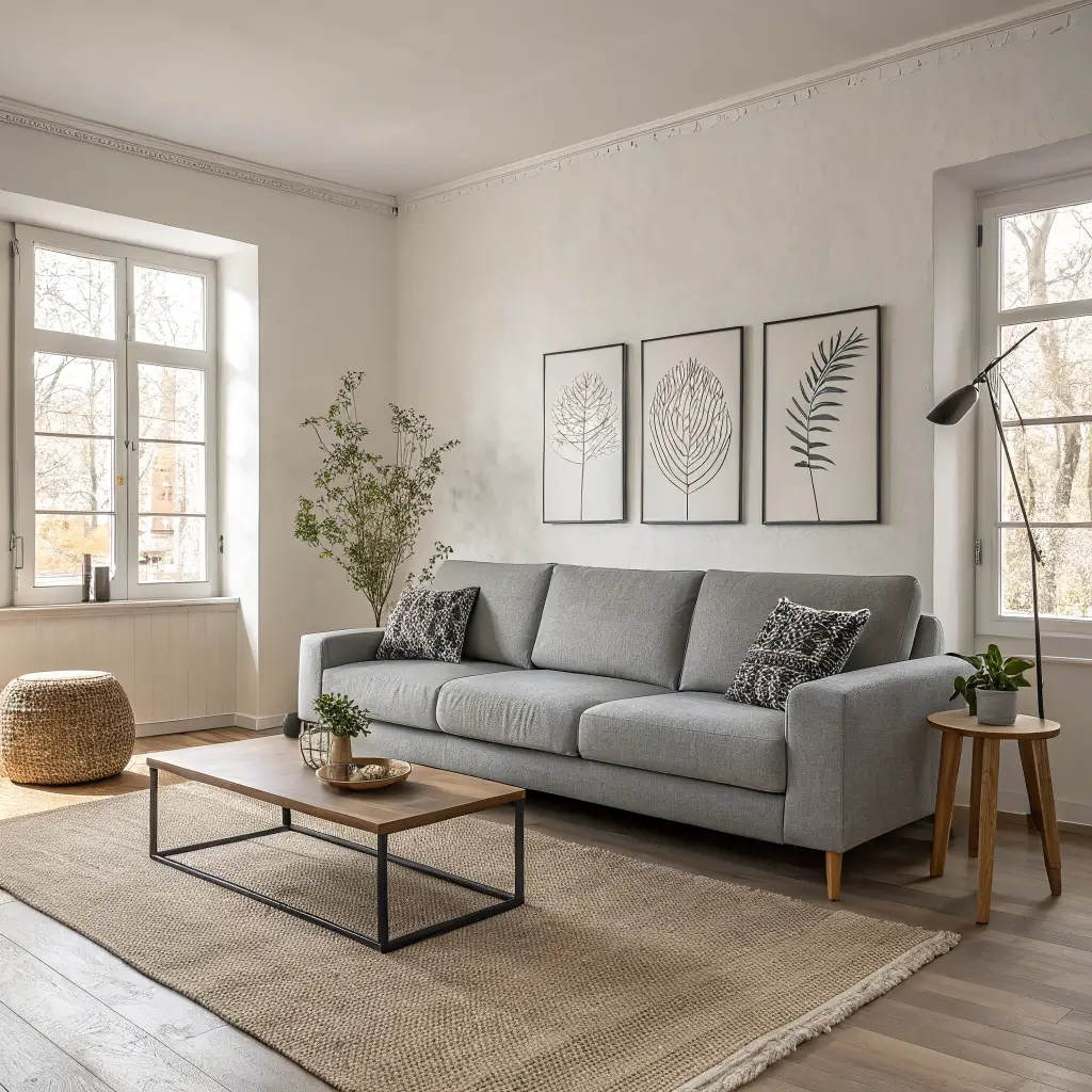 Let’s kick things off with my personal favorite – the modern minimalist approach. I love how a sleek gray couch becomes the perfect centerpiece when you strip everything else back to basics. Think clean lines, zero clutter, and maybe three decorative items max.