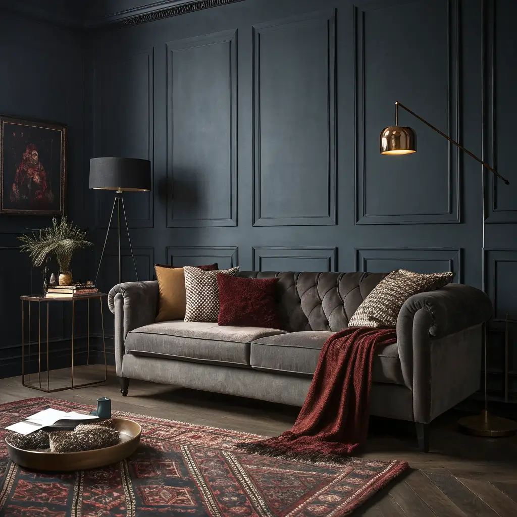 Paint your walls a deep color – navy, forest green, or even black if you’re brave enough. Your dark gray couch won’t disappear; instead, it becomes part of this cohesive, enveloping environment. Add metallic accents and strategic lighting to keep things from feeling too cave-like.