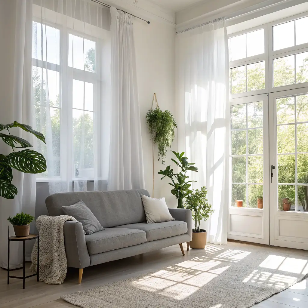 Choose a light gray couch (think dove gray or silver) and surround it with whites and creams. Sheer curtains let natural light flood in while maintaining privacy. Add mirrors strategically to bounce light around the room, making everything feel bigger and brighter.