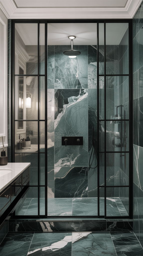 15. Green Marble Tiles with Black Framed Glass Shower
