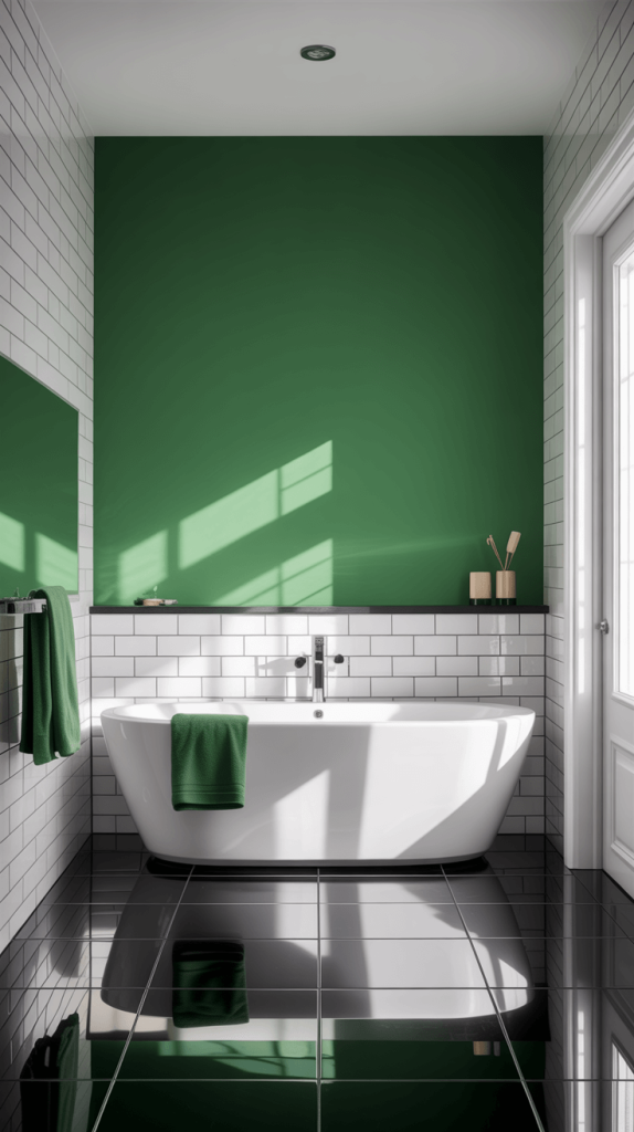 9. Green Accent Wall with Black Tiled Floor