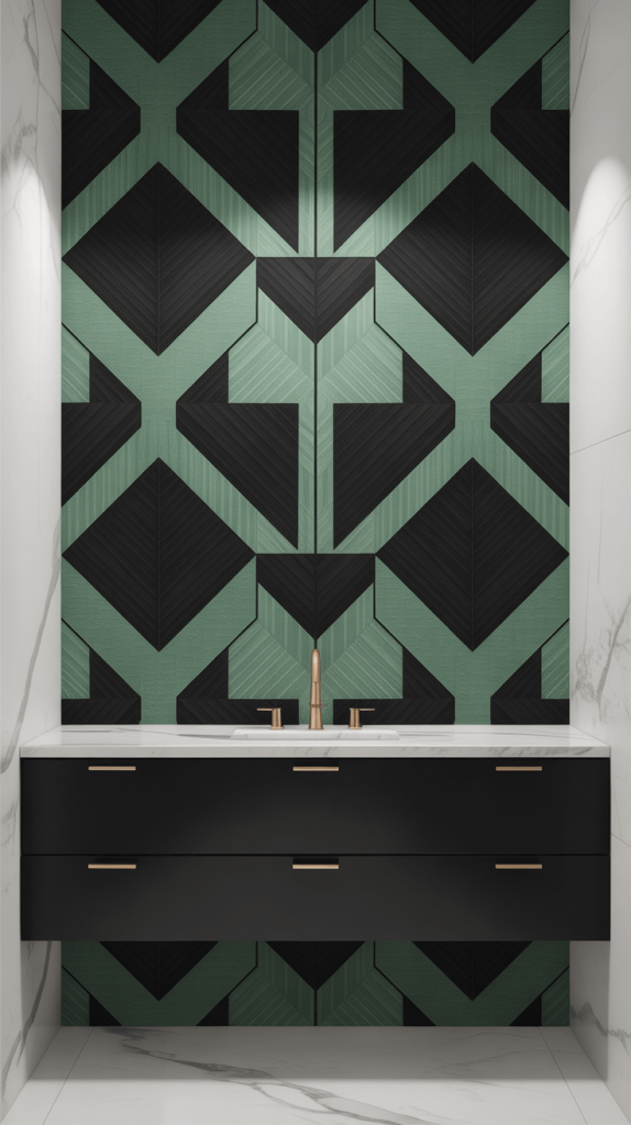 Wallpaper adds instant depth, pattern, and personality. It’s a commitment, for sure, but it’s also a relatively easy way to achieve a high-impact look. You can then pull your black and green colors from the wallpaper for your fixtures and accessories.