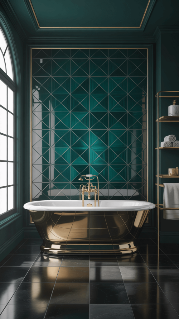 We’re talking about brushed brass or matte gold finishes. This trio—green, black, and gold—is pure old-world Hollywood glamour.