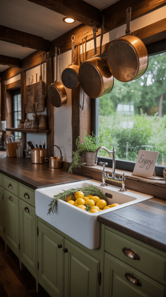 • Warm Greens are Your Friend: Instead of cool sages, lean into warmer, earthier greens. A deep, mossy green on shaker-style cabinets is a classic rustic move. It feels traditional and homey without being stuffy.
