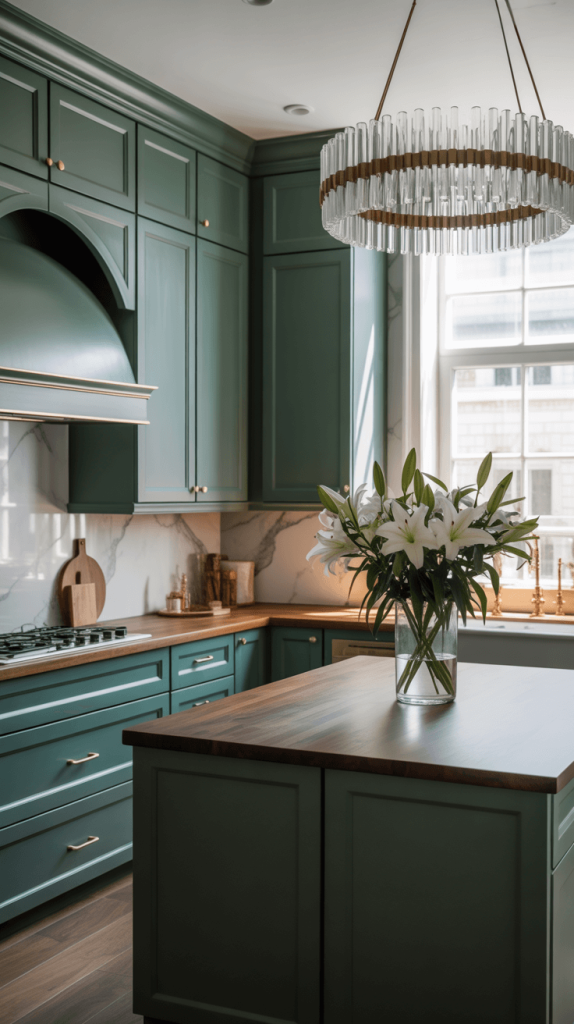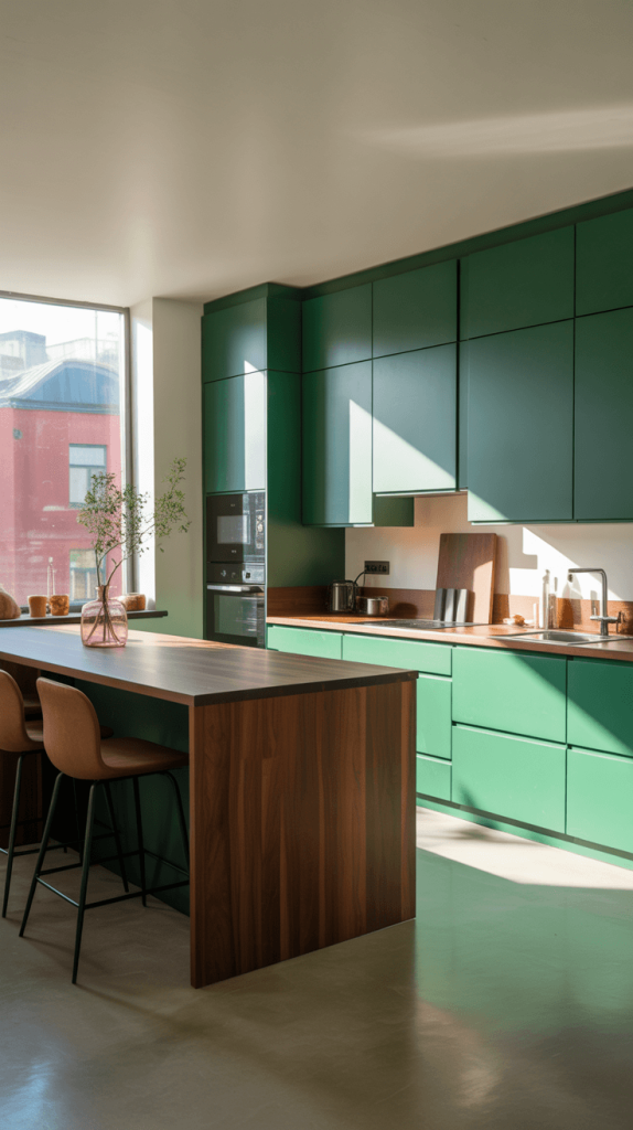 • Pair with Sleek Brown Tones: This isn’t the place for rustic, knotty pine. Integrate brown through elegant materials like a dark walnut waterfall island countertop or rich, chocolate-brown leather bar stools. The clean lines of the wood grain against the block color of the green is pure magic.