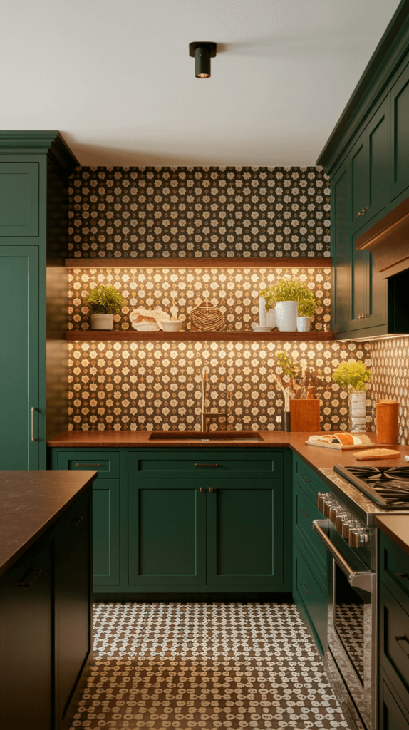 • Classic Patterns: A checkered brown and white floor tile is a quintessential vintage look. Alternatively, wallpaper a small nook or your pantry with a classic floral or botanical print that incorporates both green and brown.