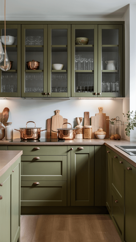 • Open Shelving Displays: Style your open shelves with a mix of green glassware, brown ceramic vases, and wooden bowls. It’s an easy, changeable way to incorporate the palette.