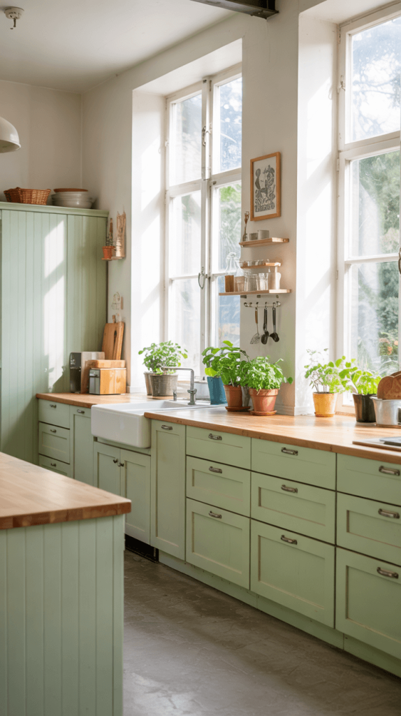 • White is Your Co-Pilot: Pair your soft green cabinets with bright white walls and ceilings. This creates a crisp, clean backdrop that makes the green pop and the space feel expansive.