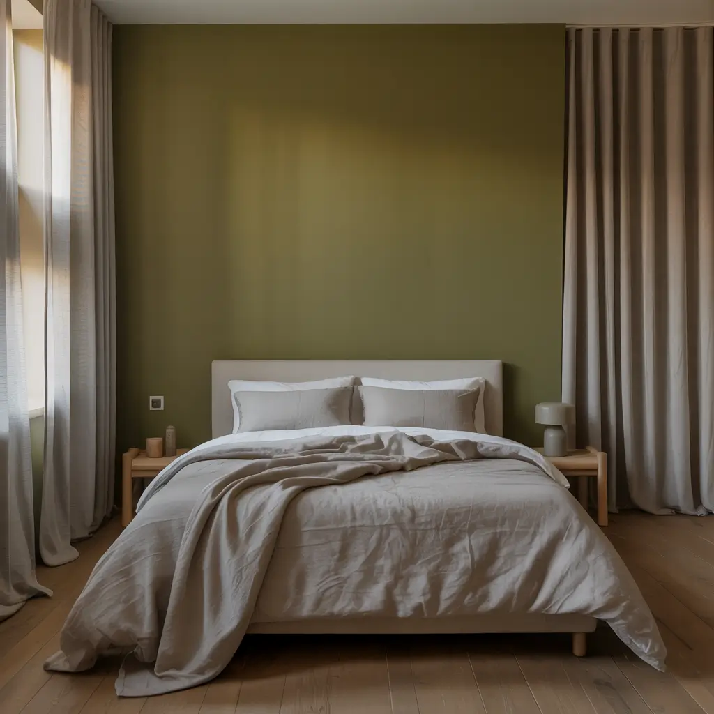 Pick your bravest wall – usually the one behind your headboard – and go full olive. Then surround it with the softest greys you can find. Think dove grey bedding, pearl grey curtains, and maybe a plush grey area rug.