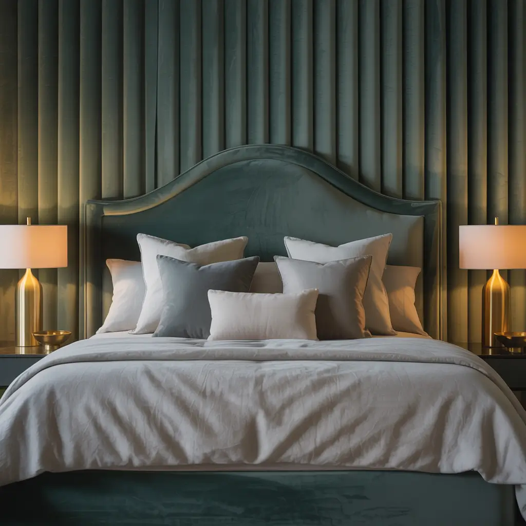 Dark Green Velvet Headboard with Grey Bedding