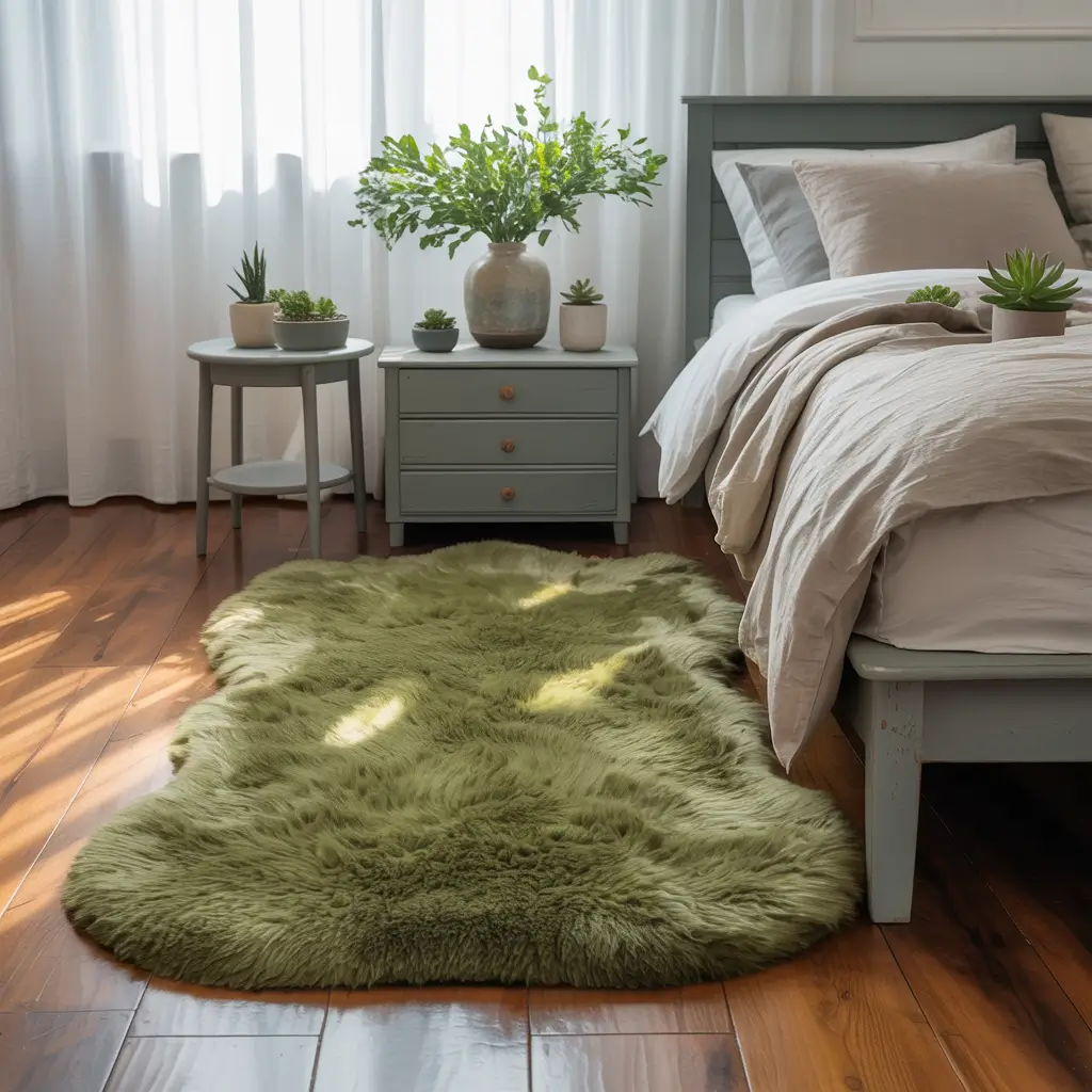 The moss green rug becomes your room’s anchor. Go for something plush and luxurious – your feet will thank you every morning. Plus, a good rug absorbs sound, making your bedroom feel more peaceful.