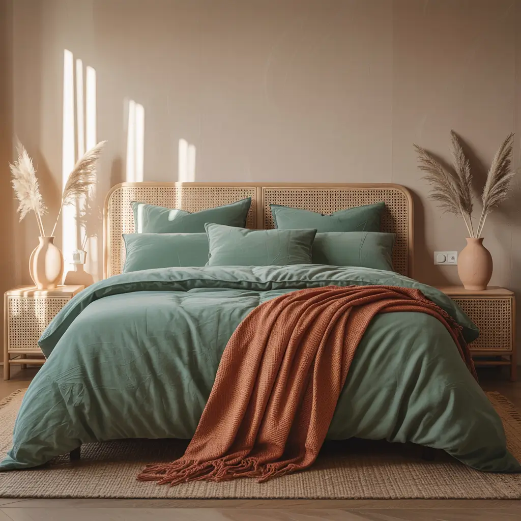 Let’s flip the script—instead of green bedding with terracotta accents, try terracotta linen sheets with plush green velvet cushions. The textural contrast alone makes this combination sing.