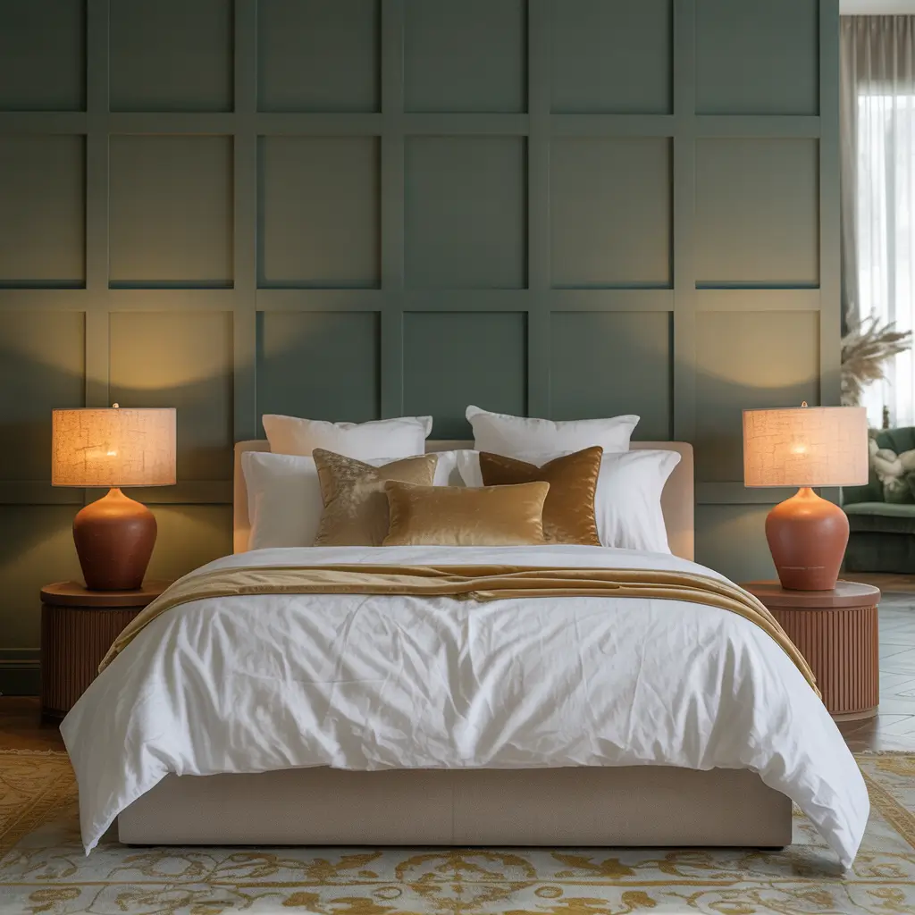 The contrast here is chef’s kiss perfect. Dark green panels create drama and sophistication, while terracotta lamps bring warmth and prevent the space from feeling too heavy. Position lamps strategically—one on each nightstand creates symmetry, while a larger floor lamp in the corner adds ambient lighting.