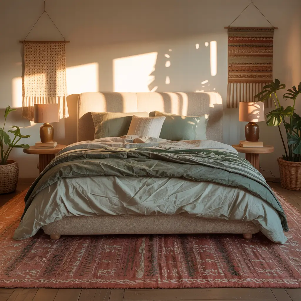 A terracotta rug anchors your bedroom like nothing else can. Place it under a bed dressed in various shades of green, and you’ve got instant grounding and warmth that makes the space feel complete.
