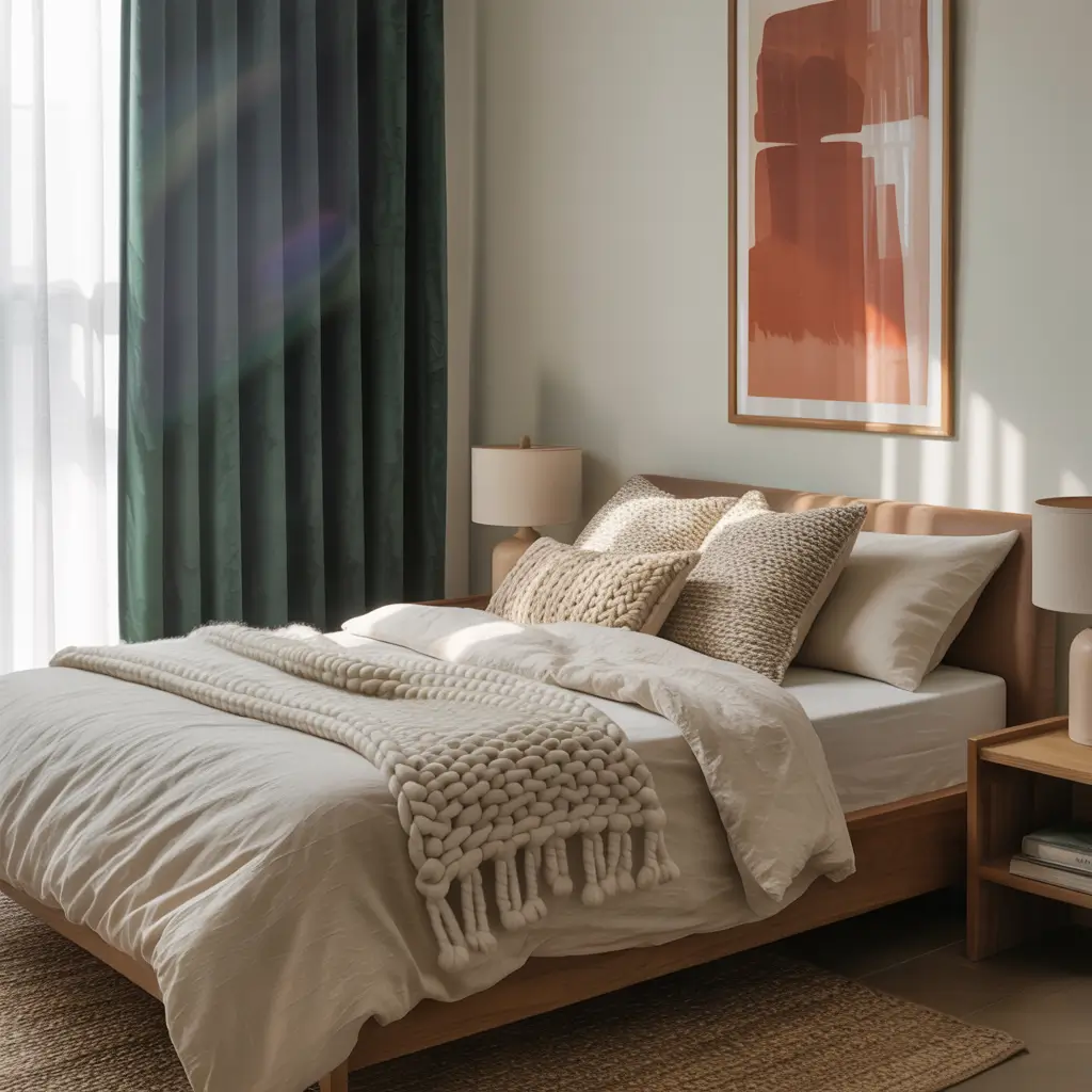 Look for throws with interesting textures—chunky knits, tasseled edges, or woven patterns. The texture adds dimension that flat bedding can’t achieve. Against a solid green duvet, that terracotta throw becomes the star of the show.