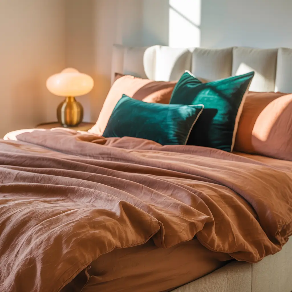Terracotta linen has this incredible ability to look both casual and luxurious. It’s wrinkled in all the right ways (meaning you don’t have to iron it), and the color makes your skin look sun-kissed. Add green velvet cushions, and suddenly your bed looks like it belongs in a boutique hotel.