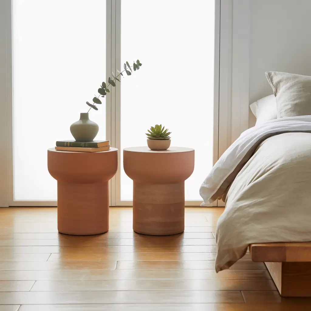 Terracotta nightstands make a bold furniture choice that pays off big time. Whether painted, stained, or naturally finished in that warm orange tone, they create anchoring points on either side of your bed.