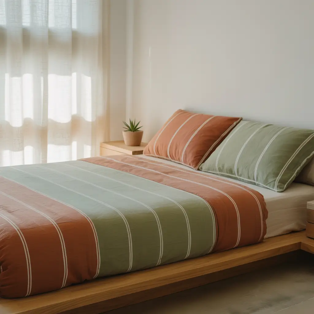 Mix stripe widths—maybe wide terracotta stripes on your duvet with thin green striped sheets, or vice versa. The key is ensuring one pattern dominates while the other supports. Too many competing stripes will make your bed look like a circus tent :/