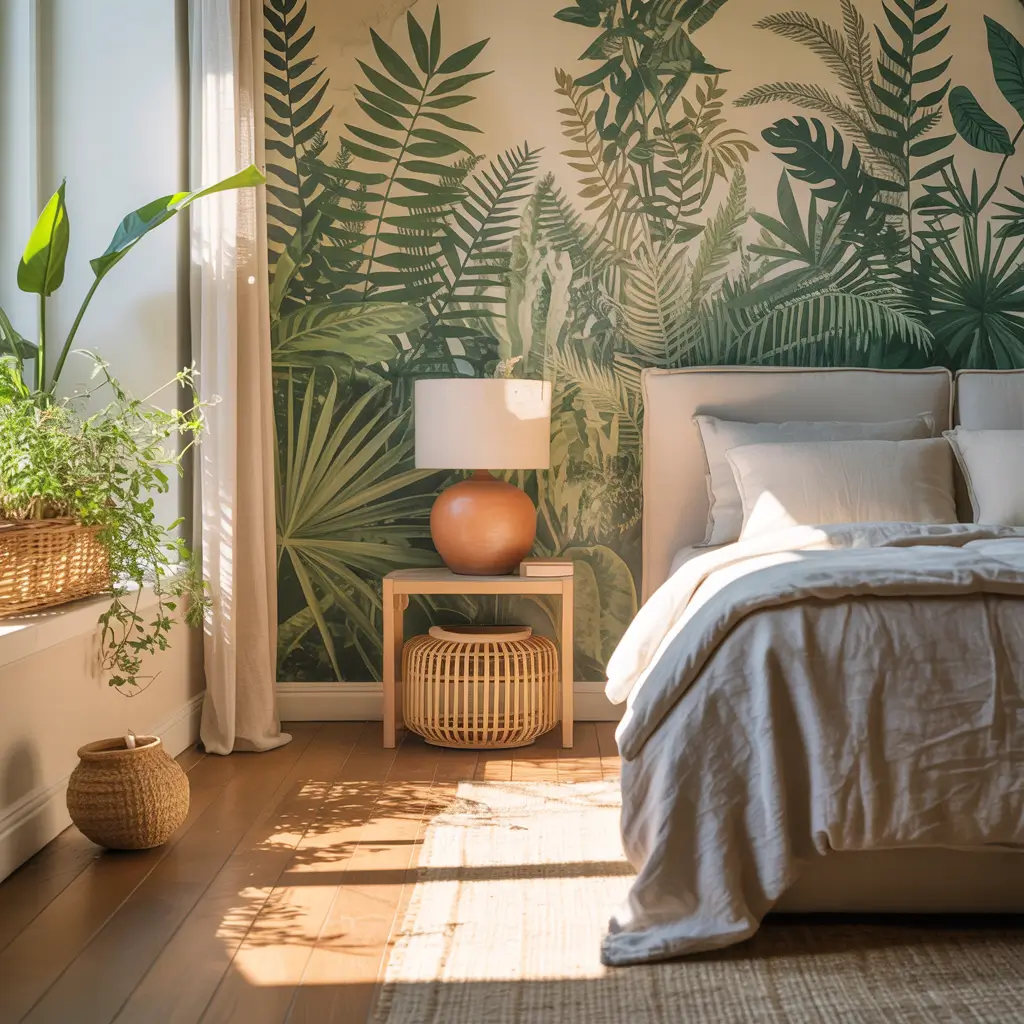 Going big with botanical wallpaper might feel scary, but trust me on this one. Green leafy patterns create an immersive environment that transforms your bedroom into a personal jungle—in the best way possible.