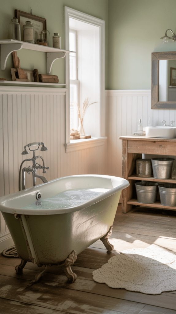 6. Farmhouse Style Green and White Bathroom: Cozy & Charming