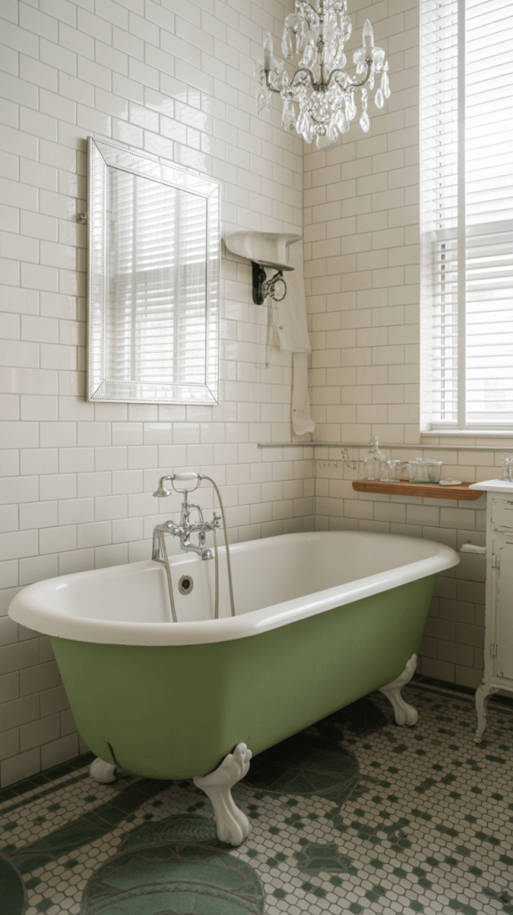 14. Vintage Green and White Bathroom Style: Nostalgic Charm