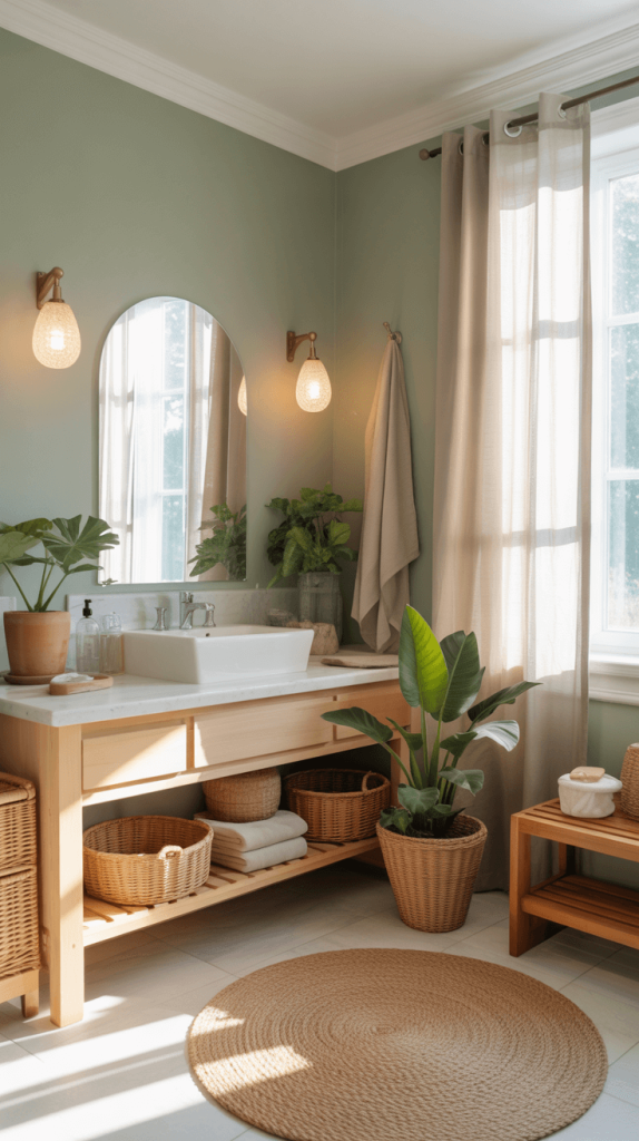- Natural Textures: This look screams for natural materials. Think a teak bath mat, woven seagrass baskets for storage, and linen curtains or towels. Add some terracotta pots with real plants to complete the serene, earthy feel.