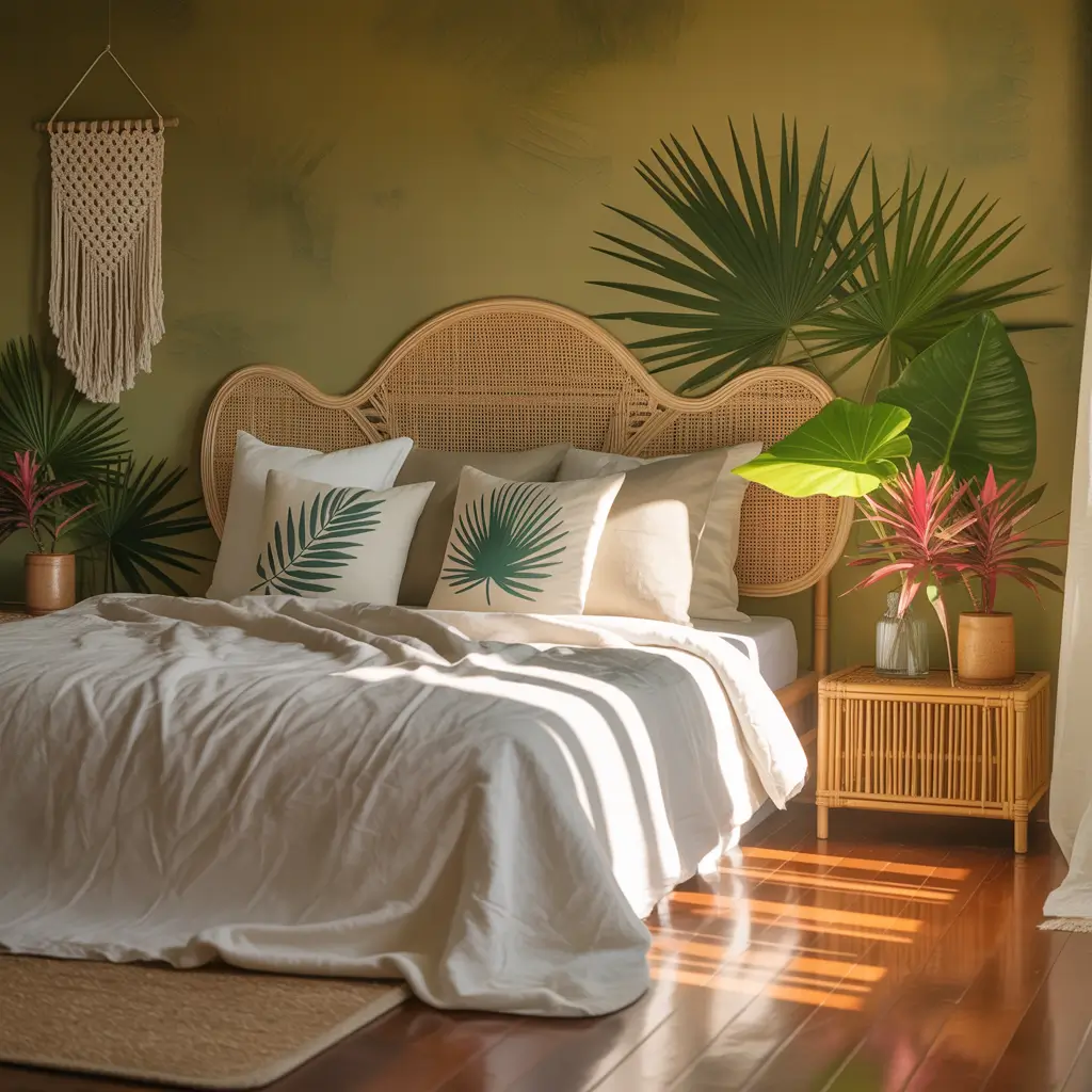 - Bold leaf patterns in bedding or wallpaper