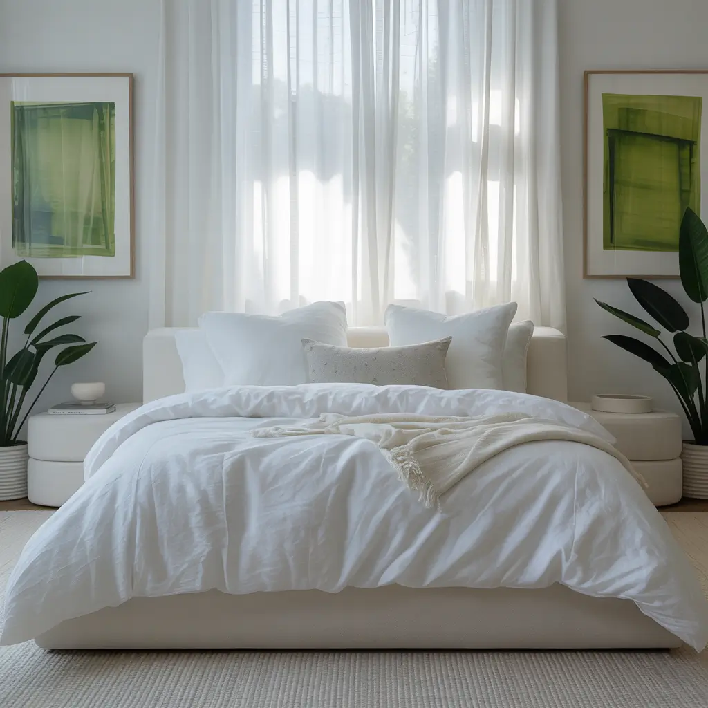 White Bedroom with Green Art Accents