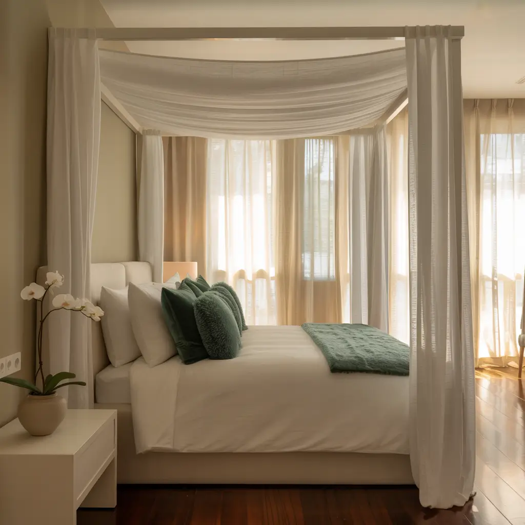 Last but definitely not least, the white canopy bed with green accents brings romance and sophistication together beautifully. This combination makes every morning feel like you’re waking up in a luxury resort.