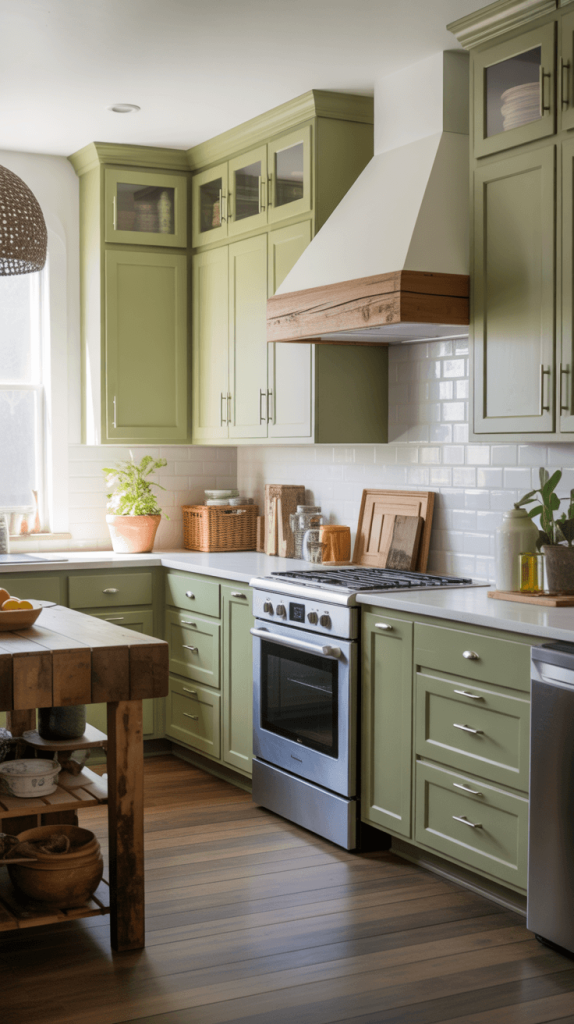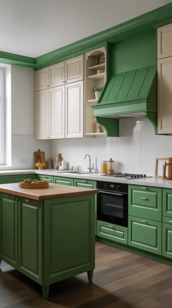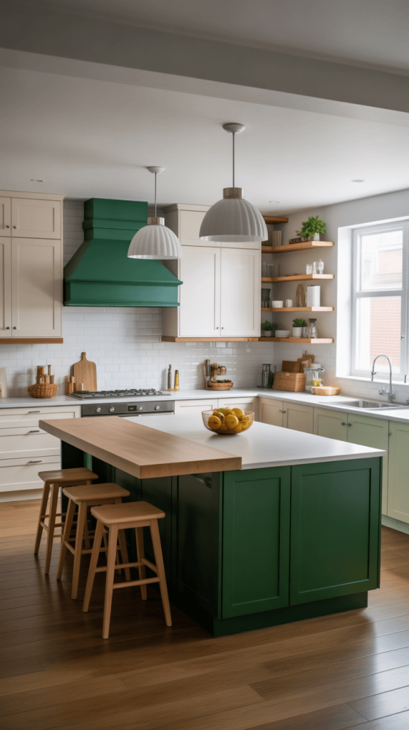 • Green as an Accent: Use green on your lower cabinets or on a single accent wall. This grounds the space without overwhelming it. Another genius hack? Paint your kitchen island green if you have one. It becomes a beautiful focal point without boxing you in.